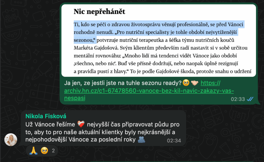 Otevřeně přiznávám, že je prosinec a leden naší nejvytíženější sezonou. To v praxi znamená, že já i kolegyně z mého nutričního týmu hledáme maximální možné kapacity pro to, abychom vám byly co nejvíce k dispozici. A ano, to i během svátků a mezi nimi. A řešíme je opravdu prozřetelně, jak naznačuje říjnový útržek z pracovní konverzace: